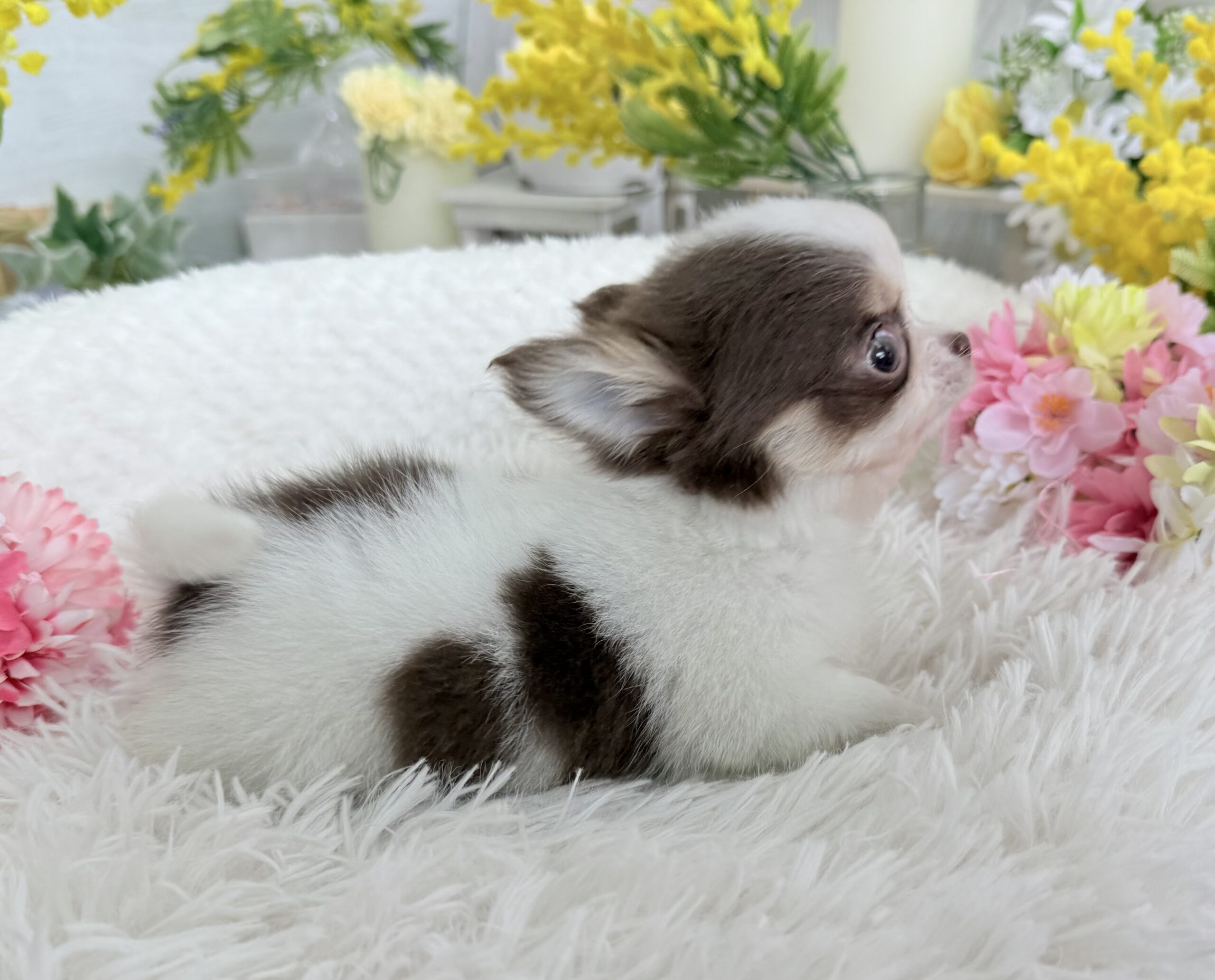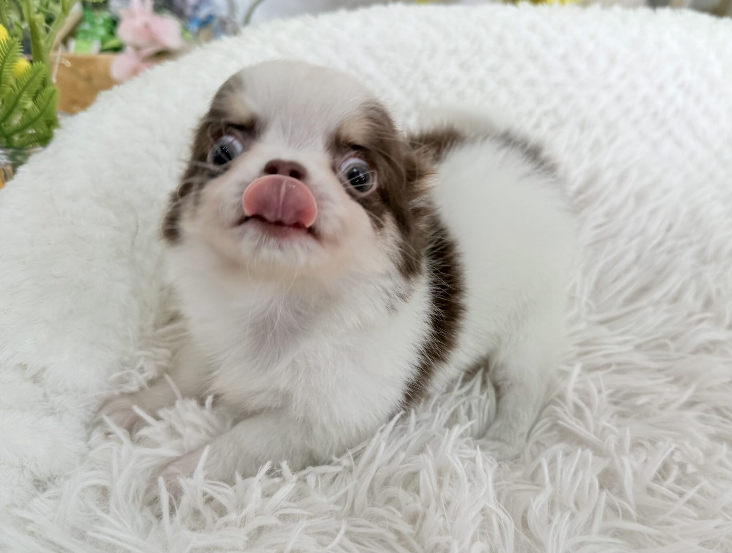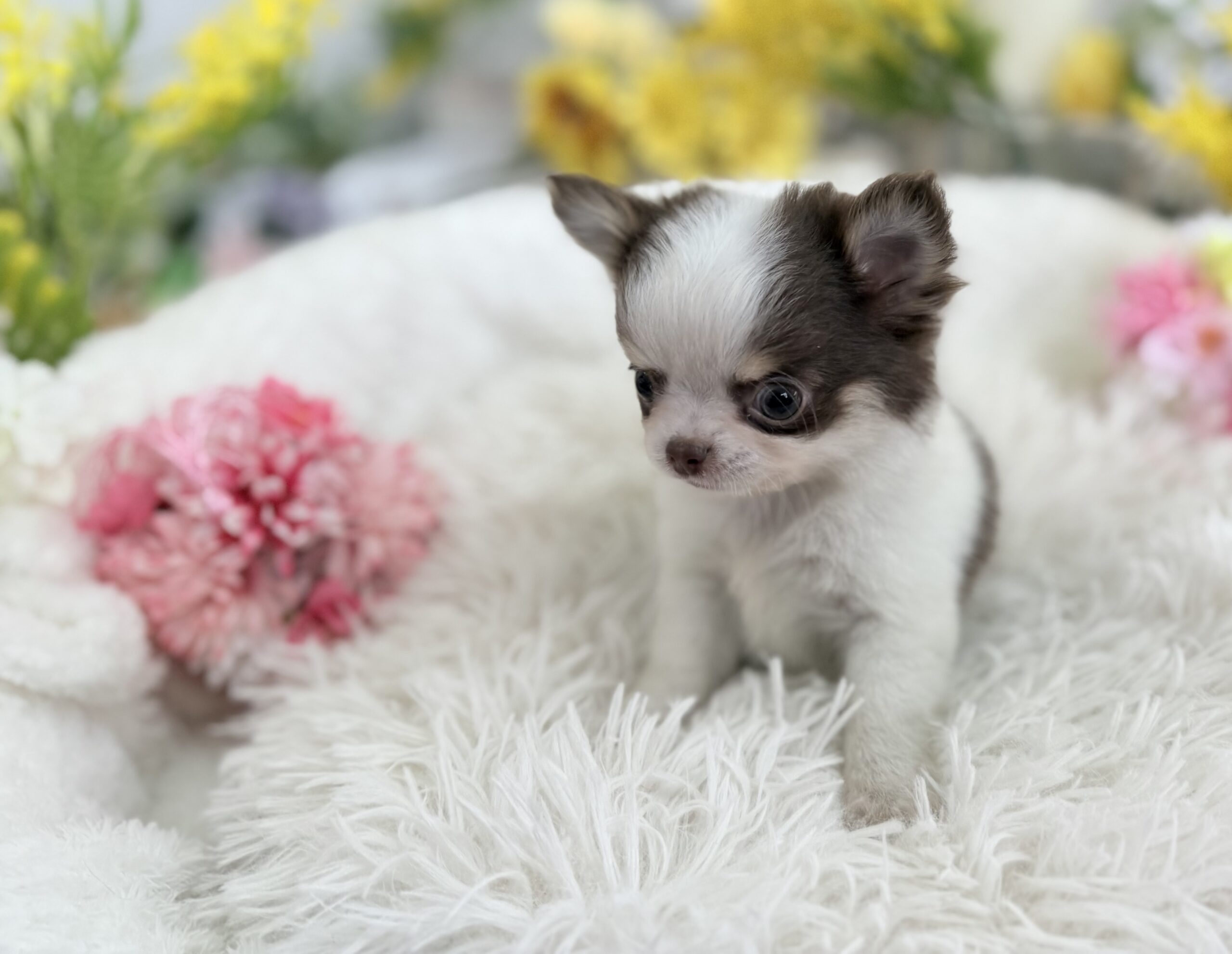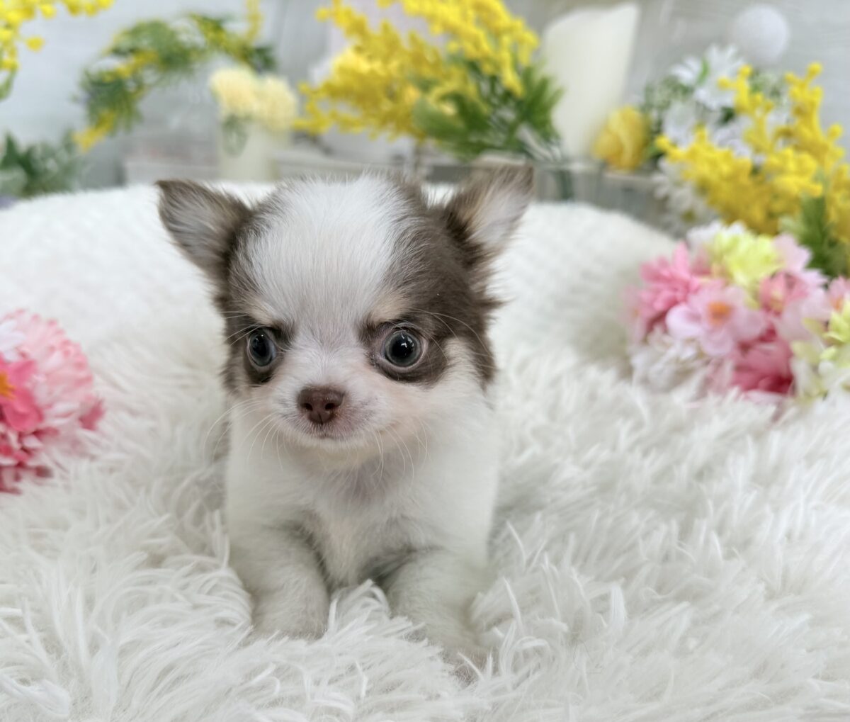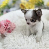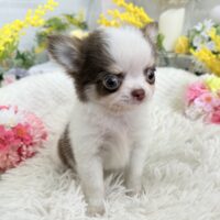 チワワ(ロング) チワワ , 犬アイコン無し チワワ(ロング) 生体価格(税込)316,000円 状況未接種 生年月日2026年 1月 6日 性別男の子 カラーホワイト&チョコレートタン 血統書あり(JKC) 出生地京都府 その他 たくさんのワンちゃんの中から,この子をご覧いただきありがとうございます。3月8日撮影2頭兄妹で誕生しました小振りな男の子です♫日に日に可愛く成長しております♪ホワイトの毛並みに、透明感のある絶妙なチョコレート色が自慢です⭐︎吸い込まれそうな綺麗な瞳がチャームポイントです♡性格は人が大好きな甘えん坊、他のわんちゃんも大好きな穏やかな懐っこい子です^ ^両親遺伝子検査 クリアです。PRA発症しません。健康診断結果 泉門あり(2月6日現在)体重 428g(2月6日現在)生まれた仔犬達はお母さんの愛情いっぱいもらいながら衛生管理整えた環境で育てています。<当犬舎のこだわり>健康で可愛い仔犬のブリーディングを心がけております。当犬舎では可愛くて健康な子犬を作出しながら、安心・親切・丁寧をもっとうとして飼い主様お1人お1人様に対応をさせて頂いております。<お問い合わせについて>当犬舎はブリーディング以外にも業務がございますので、早急にお返事ができない場合もございます。24時間以内にはお返事させていただきますのでご了承をお願いいたします。<購入予約について>予約金をいただいた時点で正式な予約とし、他のお客様からのお問い合わせの受付をストップさせていただきます。予約金は、ワンちゃんの生体価格の30%となります。*お客様都合によるキャンセルの場合は返金できませんのでご了承をお願いいたします。 お問い合わせ このページを印刷する